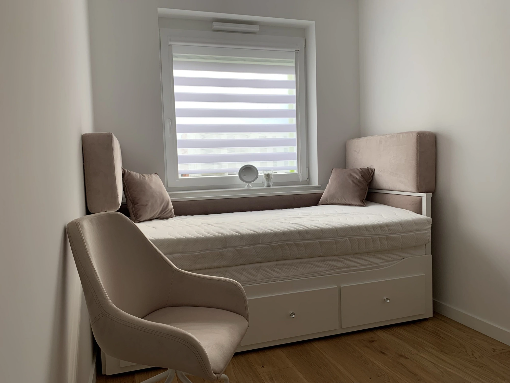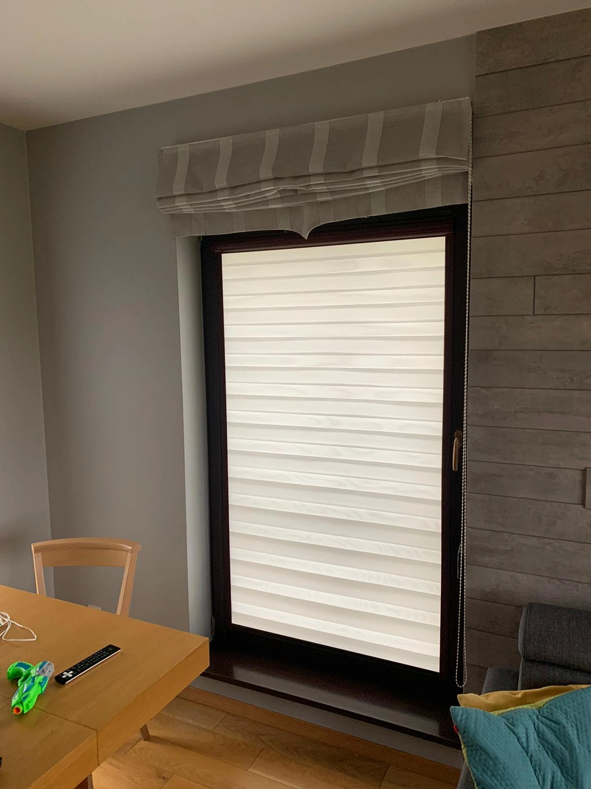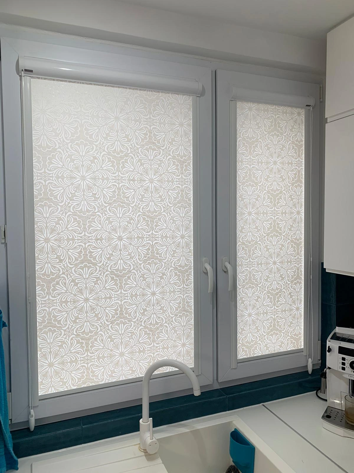 Roleta posiada kompaktową kasetę aluminiową oraz wąskie prowadnice boczne, które utrzymują materiał blisko szyby – nawet przy uchylonym oknie.